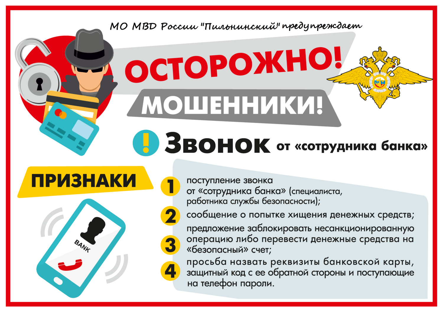 С целью предупреждения мошеннических действий в отношении граждан, а также обеспечения информирования населения о способах совершения мошенничеств и методах защиты от них на территории Нижегородской области в период с 17 июля по 17 августа 2023 года проходит акция «СТОП мошенник!» Уважаемые граждане! Сотрудники МО МВД России «Пильнинский» предупреждают, что в последнее время телефонные мошенники стали применять новый способ психологического воздействия на клиентов банков. Злоумышленники представляются сотрудниками МВД России или других правоохранительных органов и сообщают, что в отношении собеседника возбуждено уголовное дело по заявлению представителей Банка России. Получая обманным путем персональные данные, данные платежных карт, информацию о совершенных по ним операциях и другие сведения, аферисты используют их для хищения сбережений со счетов граждан. МВД России разъясняет, что в случае возбуждения уголовного дела в отношении гражданина на почтовый адрес по месту его проживания официально направляется повестка о вызове в отдел полиции к следователю или дознавателю. Повестка может быть направлена как в рамках возбужденного уголовного дела, так и в рамках доследственной проверки, проведения иных процессуальных действий. Если во время телефонного разговора незнакомец ссылается на инициированное Банком России уголовное дело – это злоумышленник. Уважаемые граждане, если вам позвонили и представились сотрудником полиции или других правоохранительных органов, свяжитесь с дежурной частью указанного собеседником подразделения и уточните, действительно ли он проходит там службу. Помните, сотрудники полиции, прокуратуры, органов исполнительной власти не просят граждан участвовать в операциях по поимке злоумышленников по телефону, тем более переводить накопления или оформлять кредиты. Так действуют только мошенники! | |